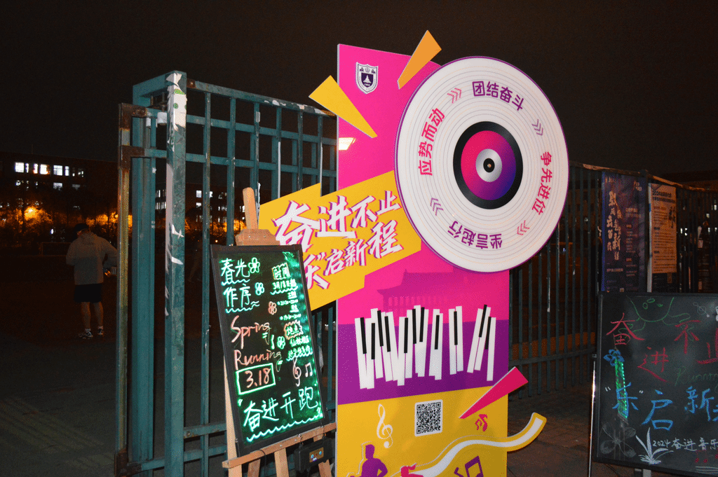 夜跑同学可前往打卡点合影记录自身变化,并扫描打卡点立牌上的二维码,将打卡照片上传至收集表中。夜跑工作人员将定期进行打卡次数统计,活动结束后,同学们可凭合影照片兑换惊喜奖品。
