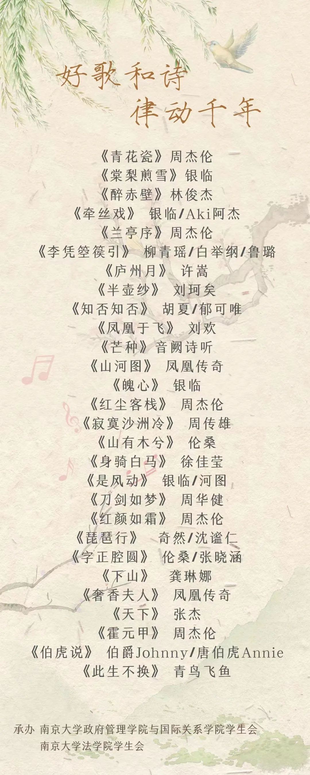 在传统与流行的结合上,南大校友银临、柳青瑶等为我们带来了不少优秀的作品;这些歌曲或清雅,或豪放,将一个个独特的故事娓娓道来。