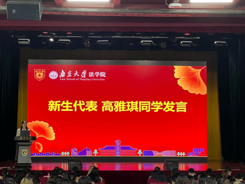 新生代表2024级硕士研究生高雅琪同学发言。她表示,作为新南大法律人,我们拥抱新机遇,也面对新挑战。以“诚朴雄伟、励学敦行”的南大校训为指引,需要做到以下几点。第一,勤勉雕琢,把法治的信仰植根于心中。第二,根植信仰,把法律人的使命扛在肩上。第三,勇担使命,以扎实的法律素养为追梦的食粮。在老师们的引领下,南大法律人一定可以肩负起新时代法治建设的使命与担当,在风华正茂的年纪书写属于我们的青春华章。
