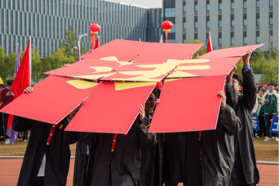 在舞蹈的高潮部分,一群身着法官服的同学缓缓步入场地中央,他们手持九张展板,每张展板上都绘有法律元素,都是法学知识的缩影。随着音乐的推进,这些同学巧妙地将展板拼凑在一起,最终形成了一个巨大的“法”字,象征着法律的庄严与权威,展现新时代中国法治建设新成就。