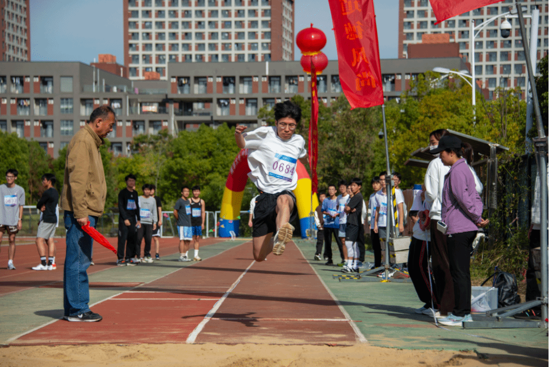 赛道上,运动员助跑加速,在沙坑前腾空一跃,划出优美弧线,随后稳稳落地,沙坑扬起细沙尘埃,场边响起同学们热烈地喝彩声。