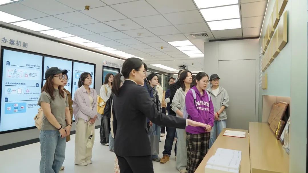 活动中,同学们先后参观了南京铁检院的知识产权案件侵权实物展示区、院史墙、12309检察服务中心、办案中心及知识产权司法保护馆。在知识产权保护馆内,通过真实侵权商品陈列、典型案例解析及普法宣传片展播,让同学们深刻体会到“创新保护没有旁观者”的司法担当;在12309检察服务中心,同学们感受到“数据多跑路、群众少跑腿”的司法为民温度。这些沉浸式体验打破了书本知识的局限,让抽象的法律条文转化为可触可感的法治实践。