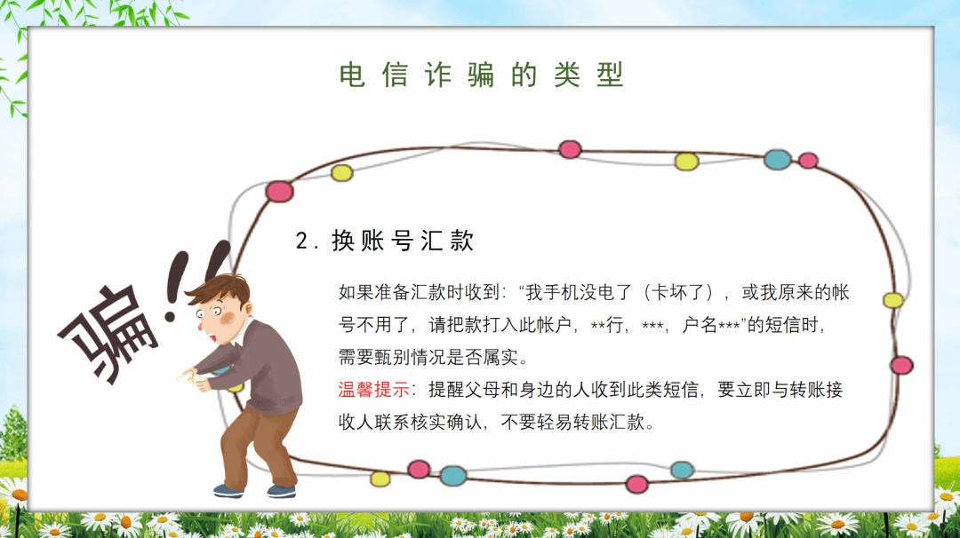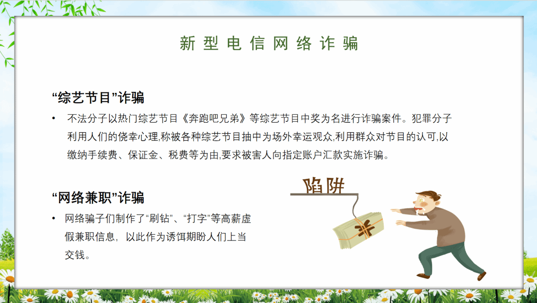 随后,为使同学们更直观地了解电信网络诈骗可能出现的情形,志愿者一一介绍了传统的电信网络诈骗类型以及新型电信网络诈骗方式,通过讲述生动形象的案例,不仅让同学们深入了解了诈骗可能出现的场景,也使他们认识到网络诈骗的危害后果,在同学们心中埋下了警惕诈骗、保护好个人信息及财产的种子。