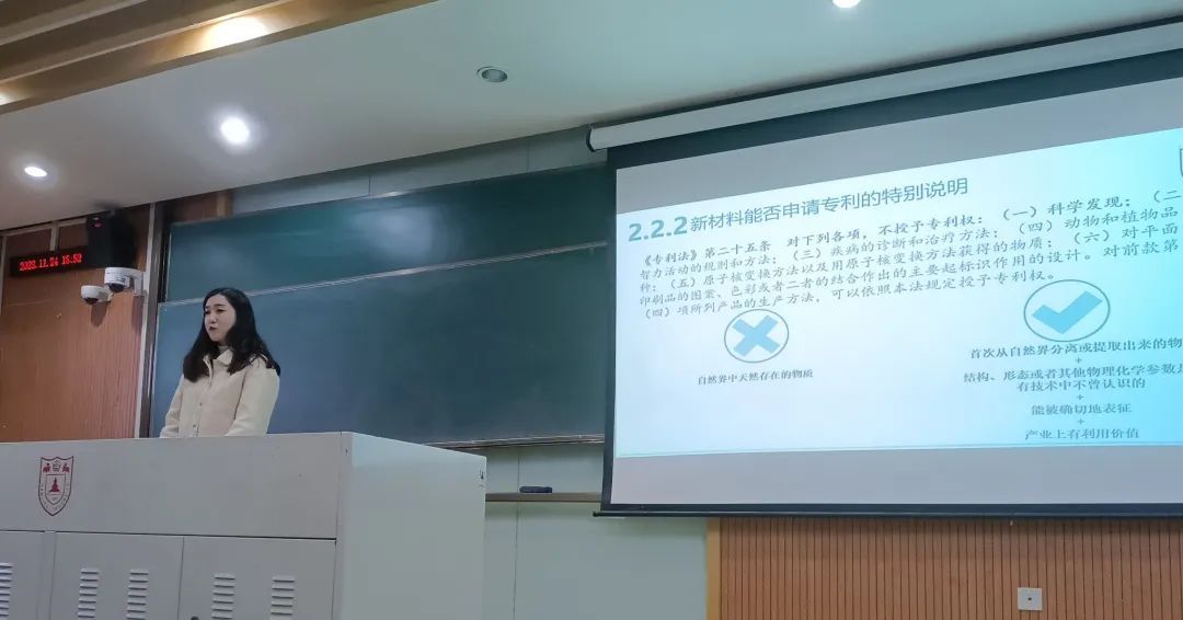 现代工程与应用科学学院,开展了“法言智汇”之“知识产权进院系(现工院篇)”的活动。在本次活动中,2023级法律硕士王晨同学围绕“材料领域的专利保护”这一现工院同学感兴趣的法律问题,进行了细致生动的普法宣讲。