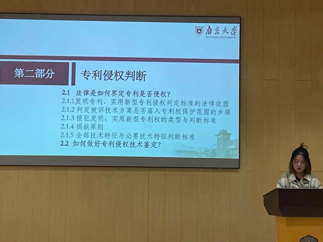 随后,为了让同学们对于专利侵权判断有更加清晰的认识,志愿者接着介绍了法律如何界定专利是否侵权,以及判定被诉技术方案是否落入专利权保护范围可以分为三步走。志愿者还向同学们介绍了如何做好专利侵权技术鉴定,分为诉讼中和诉讼外两种情况。为同学们应用知识产权相关法律知识维权奠定了扎实的基础。