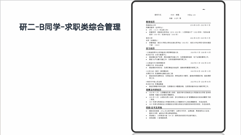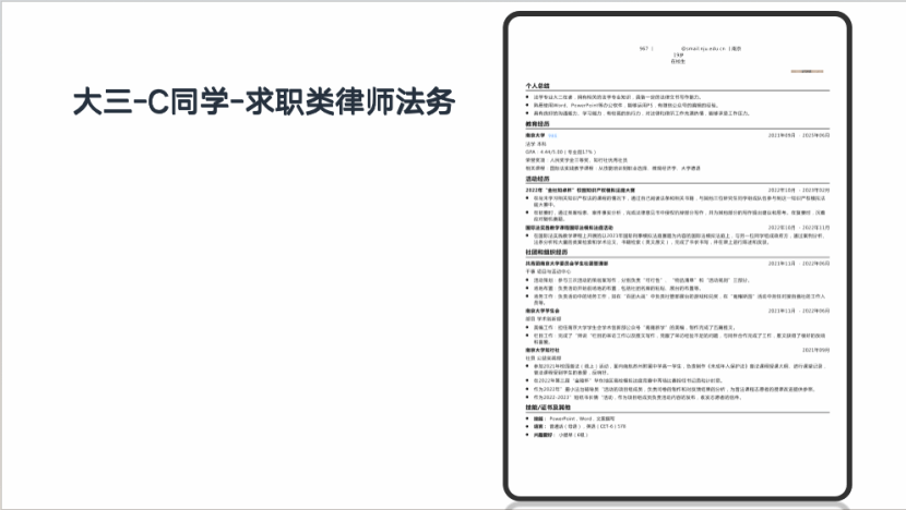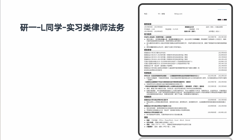 在点评、分析的过程中,李润卿学长根据简历的不同类型提出了一些要点,包括:求职类简历应明确毕业年份,律师法务岗简历应突出教育背景和实习经历,综合管理岗应突出政治面貌等等。
