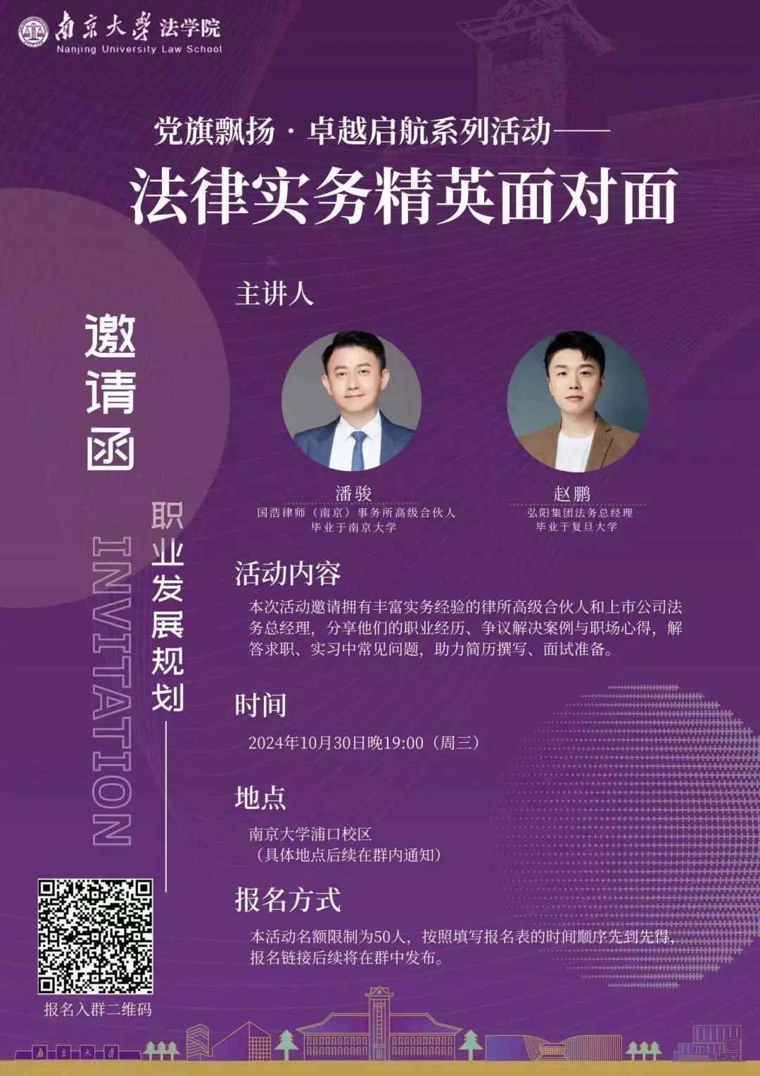 “奋进行动”精神、深化“三室一厅”建设的生动实践,增强本院学生对未来职业路径的理解、提高就业核心竞争力,卓越法律人办公室特举办“实务精英面对面”活动。本次活动将邀请拥有丰富实务经验的律所高级合伙人和上市公司法务总经理,分享他们的职业经历、典型工作案例、实务技巧与职场心得,为同学们搭建近距离接触法律实务界精英的平台。旨在帮助同学们进一步了解不同的法律工作岗位,为择业提前做好准备,同时针对性地解决同学们在求职技巧、简历撰写、面试准备等方面的问题,助力同学们顺利应对不同职场环境。
