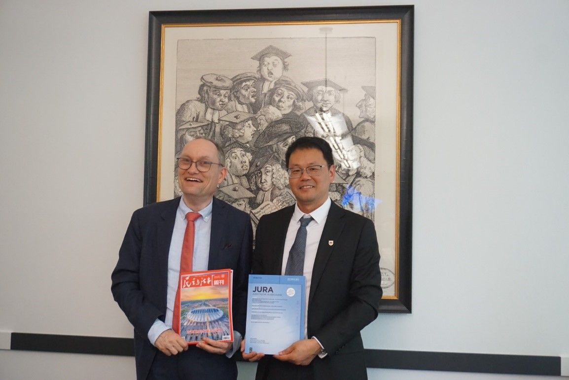 最后,南京大学法学院彭岳院长与哥廷根大学法律系保卢斯主任互相赠送了学术出版物。南京大学赠送的《民主与法制》期刊专文介绍了中德法学研究所在涉外法治人才培养方面所取得的骄人成绩;哥廷根大学回赠的《法学》(Jura)期刊登载了一名德国实习生今年春天在南京大学中德所实习四周的实习报告。座谈交流在愉快的氛围中圆满结束。