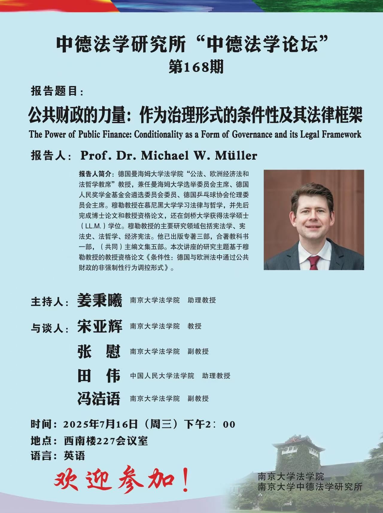 中德法学研究所的邀请,以“公共财政的力量:作为治理形式的条件性及其法律框架”为题,为第168期“中德法学论坛”做学术讲座。