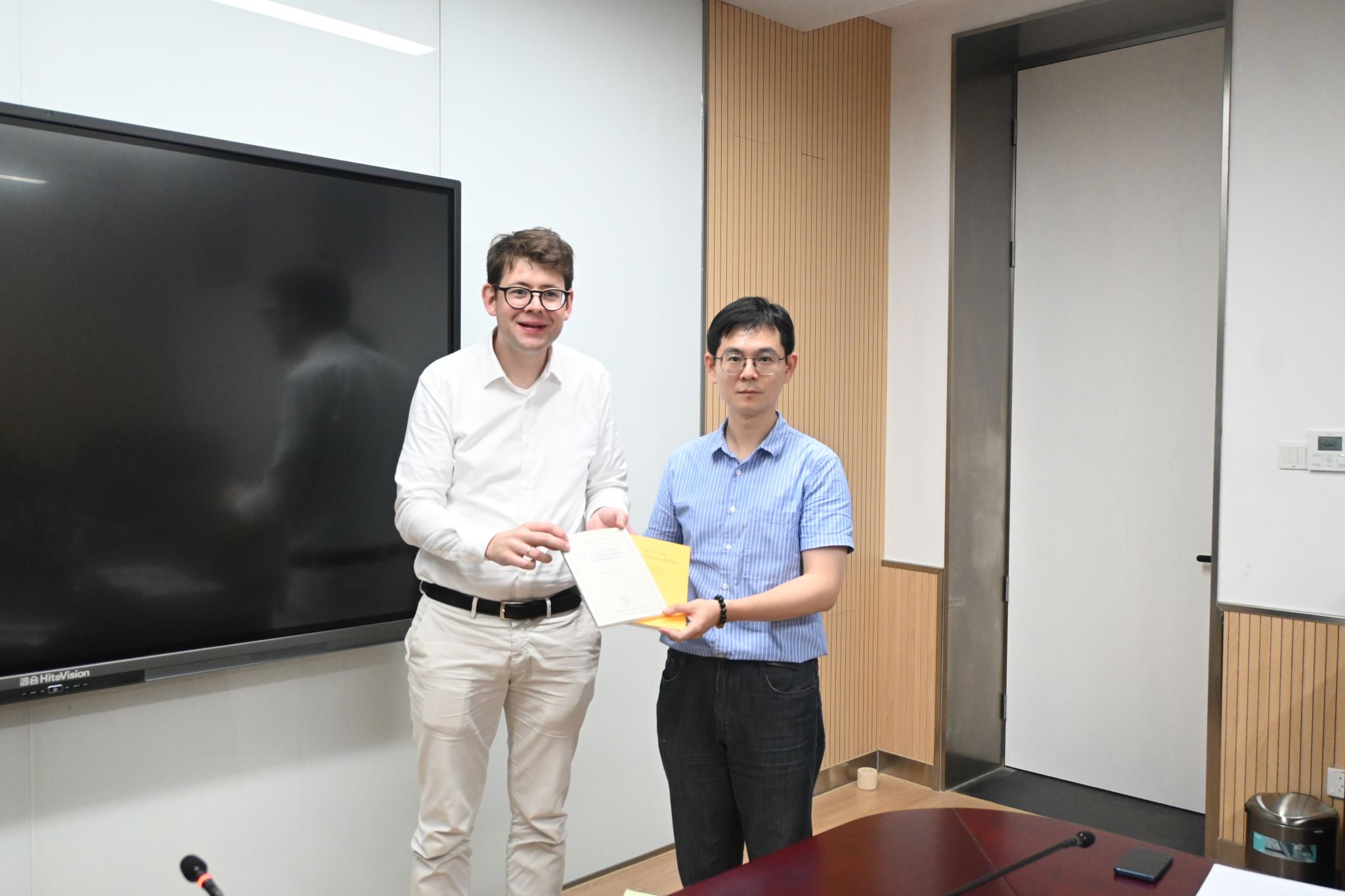 中德法学研究所的邀请表示感谢,并对中德法学研究所图书馆馆藏德国法学著作的丰富性表示赞赏。他将自己的专著《在制定法中把握时代——黑格尔的法典化理论》和主编著作《宪法史的理论》捐赠给中德法学研究所。中德法学研究所中方副所长冯洁语代表中德所接受了赠书。