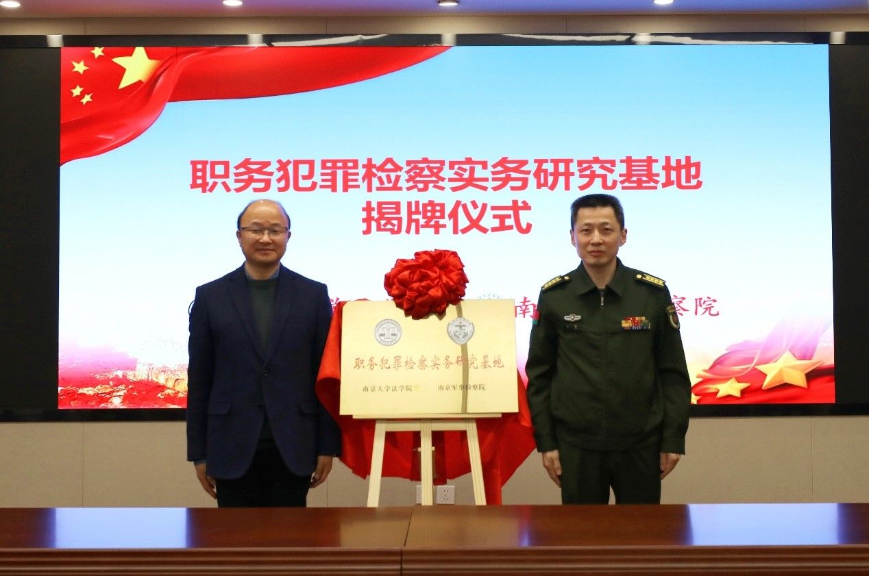 3月31日,南京大学法学院与南京军事检察院签署共建合作协议,设立职务犯罪检察实务研究基地。法学院院长彭岳与南京军事检察院大校检察长刘剑签订共建协议,法学院党委书记蒋恩铭与刘剑检察长共同为检察实务研究基地揭牌。