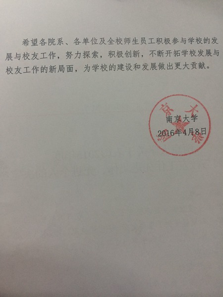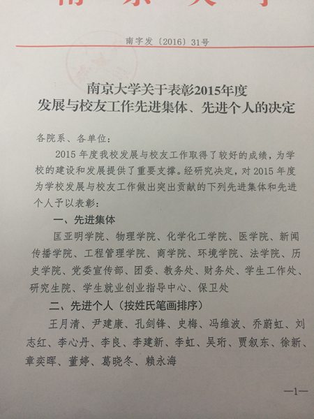 4月12日,南京大学发展与校友工作会议在仙林校区召开,会议对2015年度为学校发展与校友工作做出突出贡献的先进集体和先进个人予以表彰。我院荣获南京大学2015年度发展与校友工作先进集体。