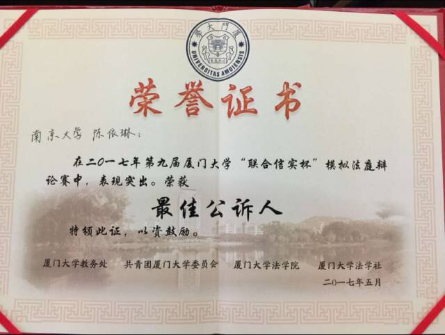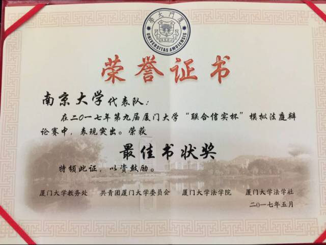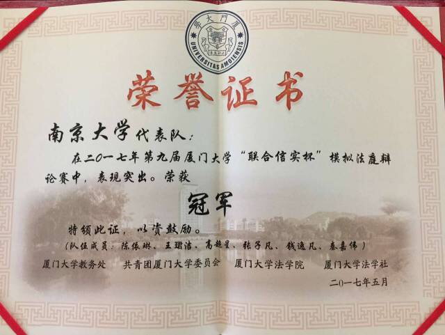 在2017年5月7日举办的第九届厦门大学“联合信实杯”模拟法庭大赛上,南京大学法学院代表队获得了冠军、最佳书状奖。我院15级本科生陈依琳同学凭借出色的表现获得了最佳公诉人奖。本次代表队参赛选手由14、15级本科生陈依琳、张子凡、高超星、钱逸凡、秦嘉伟、王珺洁同学组成,充分展现了南大法学学子的风采与才华。祝贺上述获奖同学!